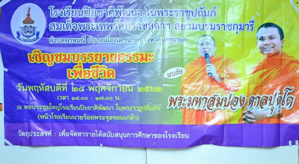 ด้วยคณะกรรมการสถานศึกษาขั้นพื้นฐานร่วมกับโรงเรียนปิยชาติพัฒนา ในพระราชูปถัมภ์ อำเภอเมือง จังหวัดนครนายก ได้กำหนดจัดงานบรรยายธรรมะเพื่อชีวิต ในวันพฤหัสบดีที่ 28 พฤศจิกายน พ.ศ. 2562 ณ หอประชุมใหญ่โรงเรียนปิยชาติพัฒนา ในพระราชูปถัมภ์ (หน้าโรงเรียนนายร้อยพระจุลจอมเกล้า)เวลา 14.00น.-17.00น. โดยมีวัตถุประสงค์เพื่อจัดหารายได้สนับสนุนการศึกษาของโรงเรียน