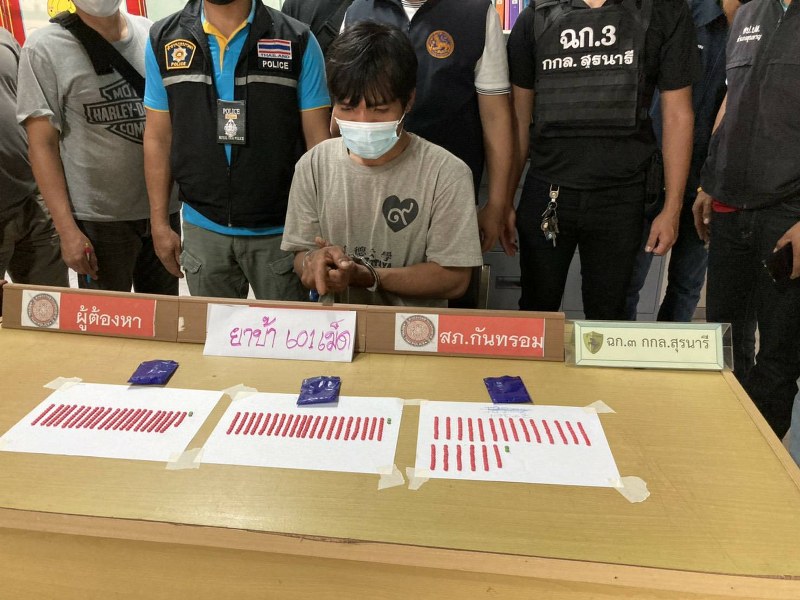 - เวลา 15.00 น. ได้ร่วมกันจับกุมตัว นายวิชาญ สีดาพันธ์ อายุ 31 ปี บ้านเลขที่ 98 ม.7 ต.โพธิ์กระสังข์ อ.ขุนหาญ จ.ศรีสะเกษ พร้อมด้วยของกลาง เป็นยาเสพติดประเภท 1(ยาบ้า) ลักษณะเม็ดสีส้ม จำนวน 595 เม็ด และลักษณะเม็ดสีเขียว จำนวน 6 เม็ด รวมยาบ้าทั้งหมด 601 เม็ด และผลตรวจปัสสาวะเป็นบวกจากโรงพยาบาลขุนหาญ