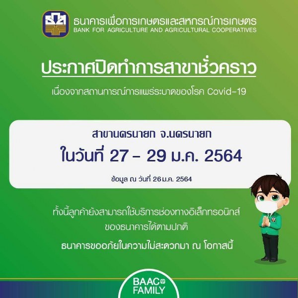 เบื้องต้นทางธนาคาร ธกส.สาขานครนายก ได้ปิดทำการเป็นเวลา 3 วัน วันที่ 27 -29 มกราคม 2564 ทั้งนี้มีผู้สัมผัสเสี่ยงสูงจำนวน 20 ราย อยู่ระหว่างการตรวจหาเชื้อ ที่ รพ.นครนายก หากผู้ใดสงสัยว่าจะสัมผัสโรคจากผู้ป่วยให้แจ้งเจ้าหน้าที่สาธารณสุขใกล้บ้านของท่านเพื่อขอเข้ารับการตรวจหาเชื้อที่โรงพยาบาลในพื้นที่ (รพ.นครนายก ,รพ.บ้านนา , รพ.องครักษ์ , รพ.ปากพลี )