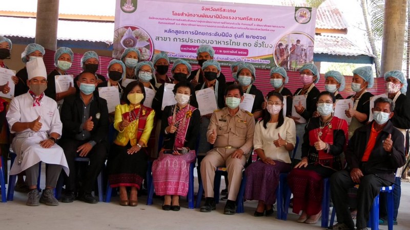 นางทัศนี ขจัดมลทิน ผอ.สำนักงานพัฒนาฝีมือแรงงานศรีสะเกษ กล่าวว่า โครงการนี้มีวัตถุประสงค์เพื่อให้ผู้เข้ารับการอบรมได้มีความรู้ด้านการประกอบอาหารไทย สามารถกลับไปประกอบอาชีพให้บริการแก่นักท่องเที่ยวได้อย่างมีศักยภาพ ได้มาตรฐาน ถูกสุขลักษณะ มีรายได้เลี้ยงตนเองและครอบครัว ยกระดับคุณภาพชีวิตดีขึ้นอย่างยั่งยืน โดยได้รับการสนับสนุนงบประมาณ จาก นายวัฒนา พุฒิชาติ ผู้ว่าราชการจังหวัดศรีสะเกษ งบประมาณจังหวัดศรีสะเกษในการพัฒนากลุ่มเป้าหมายในพื้นที่ท่องเที่ยว โดยเฉพาะกลุ่มโฮมสเตย์ให้ได้รับความรู้ ทักษะ และเทคนิคในการปรุงประกอบอาหารไทย ถูกต้องตามหลักวิชาการ ถูกสุขลักษณะ นำไปปรับประยุกต์ในการประกอบอาหารไทย รองรับกลุ่มนักท่องเที่ยวในพื้นที่ และให้ผ่านฝึกอบรมติดต่อสมัครเข้ารับการทดสอบมาตรฐานฝีมือแรงงานแห่งชาติในโอกาสต่อไป