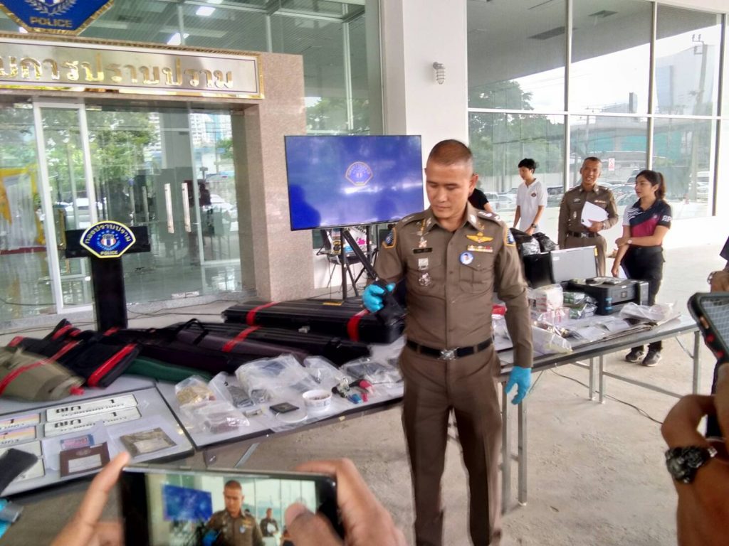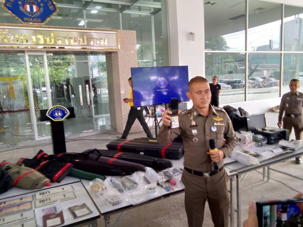 วันนี้ วันพุธที่ 24 ก.ค.62 เวลา 15.30 น.ที่กองบังคับการปราบปราม : พล.ต.ต.จิรภพ ภูริเดช ผบก.ป. พร้อมด้วยพ.ต.อ.สุรพงษ์ ชาติสุทธิ์ รองผบก.ป.,พ.ต.อ.ธงชัย อยู่เกษ ผกก.1 บก.ป.,พ.ต.อ.บุญลือ ผดุงถิ่น ผกก. 3 บก.ป. และพ.ต.อ.วิจักขณ์ ตารมย์ ผกก.สนับสนุน บก.ป. ร่วมแถลงข่าวผลการจับกุม นายณัฐพงษ์ ธรรมทอง อายุ 37 ปี อยู่บ้านเลขที่ 66/34 รัชดา-รามอินทรา แขวงรามอินทรา เขตคันนาว กทม. ผู้ต้องหาคดีครอบครองอาวุธปืน และยาเสพติด (ยาไอซ์) ซึ่งจับกุมตัวได้ที่อาคารจอดรถภายในสนามบินดอนเมือง กรุงเทพฯ จากการตรวจค้นรถยนต์ยี่้ห้อเบนซ์ ป้ายแดงเบนซ์ รุ่น GLC 250 D ของผู้ต้องหาพบอาวุธปืนออโตเมติก ทั้งกล็อคและโค้ท จำนวน 5 กระบอก เงินสดอีก 4 ล้านบาท ก่อนนำตัวมาสอบสวนขยายผลการจับกุม