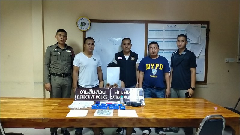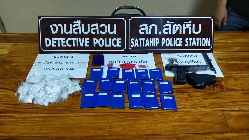 ตร.สัตหีบ รวบเอเย่นส่งยาเสพติด ได้ของกลาง ยาบ้า 3,528 เม็ด ไอซ์ 304.03กรัม พร้อมปืน 2 กระบอก กระสุน 36 นัด