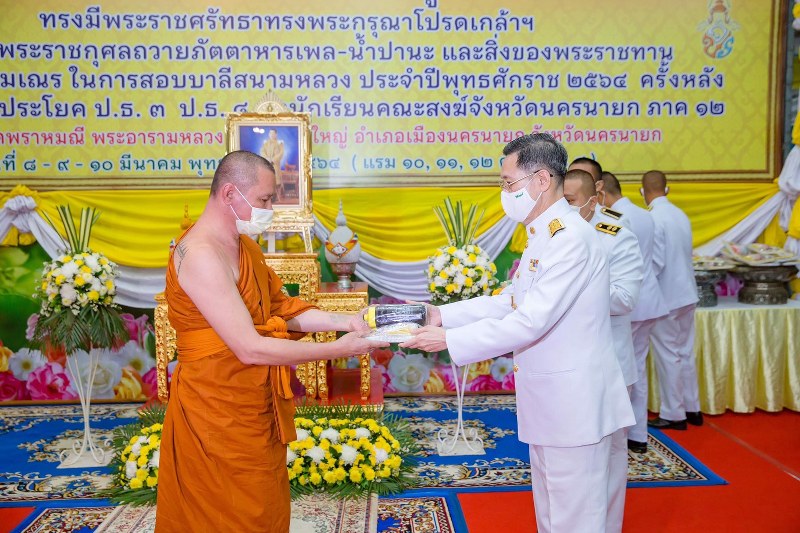 นครนายก – พระบาทสมเด็จพระเจ้าอยู่หัวทรงพระกรุณาโปรดเกล้า ฯ พระราชทาน ให้ถวายภัตตาหารเพล และสิ่งของพระราชทาน แด่พระภิกษุ สามเณร ในการสอบบาลีสนามหลวง ประจำปี พ.ศ. 2564 ในระหว่างวันที่ 8-10 มีนาคม 2564