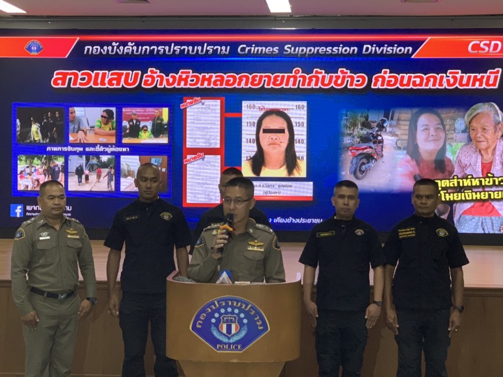 จากนั้น หญิงดังกล่าวก็มาตีสนิทอ้างเป็นเพื่อนกับลูกสาว บอกหิวข้าว ยายจึงเห็นใจจะตำส้มตำมาให้กิน และเข้าไปเตรียมเครื่องปรุงในห้องครัวในบ้าน เมื่อหญิงคนนั้นเห็นก็บอกให้ยายมาตำส้มตำข้างนอก โดยยกครก ยกสาก และเครื่องปรุงขนออกมานอกบ้าน ก่อนจะอ้างว่า ปวดท้องขอเข้าห้องน้ำ ยายจึงชี้ให้ไปเข้าห้องน้ำในบ้านโดยไม่ได้เอะใจอะไร ไม่นานก็ขอเข้าอีก 2 ครั้ง ยายเห็นลูกสาวหน้าตาเพลีย ๆ คิดว่าคงจะหิว จึงบอกให้สามีออกไปซื้อไก่ย่างมาเพิ่มอีก เพราะเห็นว่าเป็นเพื่อนลูกสาว ระหว่างที่ตนไปหาแก้วหาจานภายในบ้านออกมา ก็ไม่เห็นหญิงสาว จนกระทั่งสามีซื้อไก่ย่างเข้ามา ก็ไม่พบหญิงคนนั้นแล้ว จึงเริ่มเอะใจเข้าไปดูที่เก็บเงิน ปรากฏว่าเงินที่ลูกสาวเอามาให้เมื่ออาทิตย์ก่อน 10,000 บาท กับทองรูปพรรณอีก 1 บาทรวมมูลค่ากว่า 30,000 บาท ที่ใส่ในกระเป๋าเสื้อในได้หายไปทั้งหมด จึงรู้ว่าถูกหลอกด้าน นายพรชัย โนไธสง อายุ 54 ปี ผู้ใหญ่บ้านหมู่ 9 ซึ่งเป็นลูกเขยยาย ขับรถผ่านมาเห็นคนแปลกหน้าจึงถ่ายภาพหญิงสาวและรถที่ขับมาเอาไว้เป็นหลักฐาน เผื่อเป็นคนไม่ดี สุดท้ายก็เป็นนักต้มตุ๋นตามที่เป็นข่าวมาหลายครั้ง สำหรับเหตุการณ์ในลักษณะดังกล่าว เคยเกิดขึ้นมาแล้วหลายครั้งในจ.บุรีรัมย์ ด้วยวิธีเดียวกัน แต่ยังไม่สามารถจับคนร้ายได้ เพราะไม่มีหลักฐาน แต่ครั้งนี้มีภาพถ่ายชัดเจน