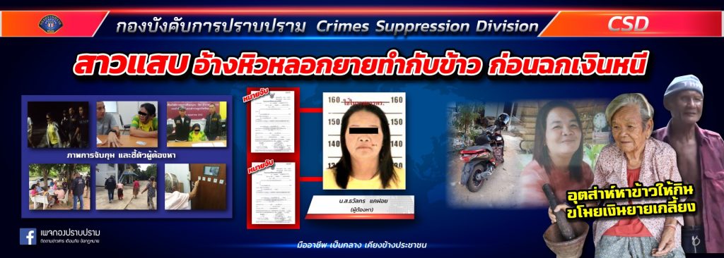 เมื่อวันที่ 19 กรกฎาคม 2562 สภ.นาโพธิ์ จ.บุรีรัมย์ ได้รับการร้องทุกข์จาก แม่เฒ่าวัย 80 ปี ชื่อนางนวลศรี สิงห์ไธสง อายุ 80 ปี และ นายลี สิงห์ไธสง อายุ 80 ปี สองสามีภรรยาซึ่งปกติจะอยู่บ้านตามลำพัง กล่าวว่า เมื่อวันที่ 19 ก.ค.62 ที่ผ่านมา เวลาประมาณ 11.00 น. ตั้งใจตำส้มตำให้หญิงอ้างเป็นเพื่อนลูกสาว หลังบอกหิวโซ สุดท้ายขโมยเงิน กว่า 10,000 บาท ทองอีก 1 บาท ตอนนั้นตนนั่งเล่นอยู่หน้าบ้านคนเดียว ได้มีหญิงอายุประมาณ 40 ปี รูปร่างท้วม ผมประบ่า ขี่รถจักรยานยนต์สีแดง ไม่ติดแผ่นป้ายทะเบียนมาจอดหน้าบ้าน ตนจึงถามว่า “มาหาใคร” หญิงคนนั้นก็ถามว่า “ลูกสาวยายชื่ออะไร” ตนจึงตอบไปว่า “ทองคำ” จากนั้นหญิงดังกล่าวก็บอกว่า “ลูกสาวยายสั่งซื้อน้ำผึ้ง 1 ขวด ราคา 150 บาท จะมาขอเก็บเงิน” ตนจึงเดินไปหยิบเงินที่เก็บไว้ในกระเป๋าเสื้อในมาให้ 150 บาท