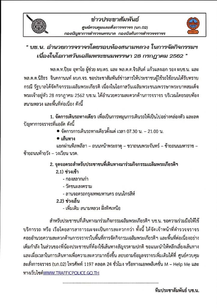 กองบัญชาการตำรวจนครบาล ขอแจ้งข่าวประชาสัมพันธ์ เพื่อให้ประชาชนได้รับทราบ ในการอำนวยความสะดวกด้านการจราจร การจัดงานเฉลิมพระเกียรติ เนื่องในโอกาสวันเฉลิมพระชนมพรรษาพระบาทสมเด็จพระเจ้าอยู่หัวฯ 28 ก.ค.62 บริเวณโดยรอบท้องสนามหลวง รายละเอียด ตามเอกสาร ดังนี้