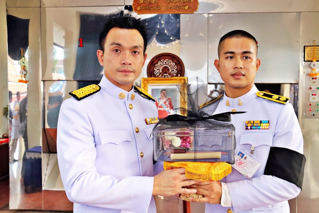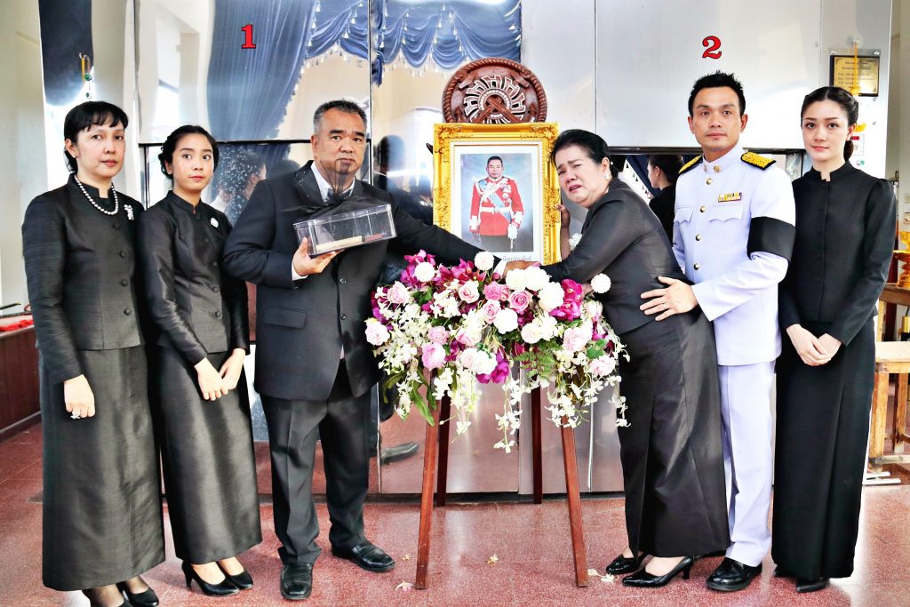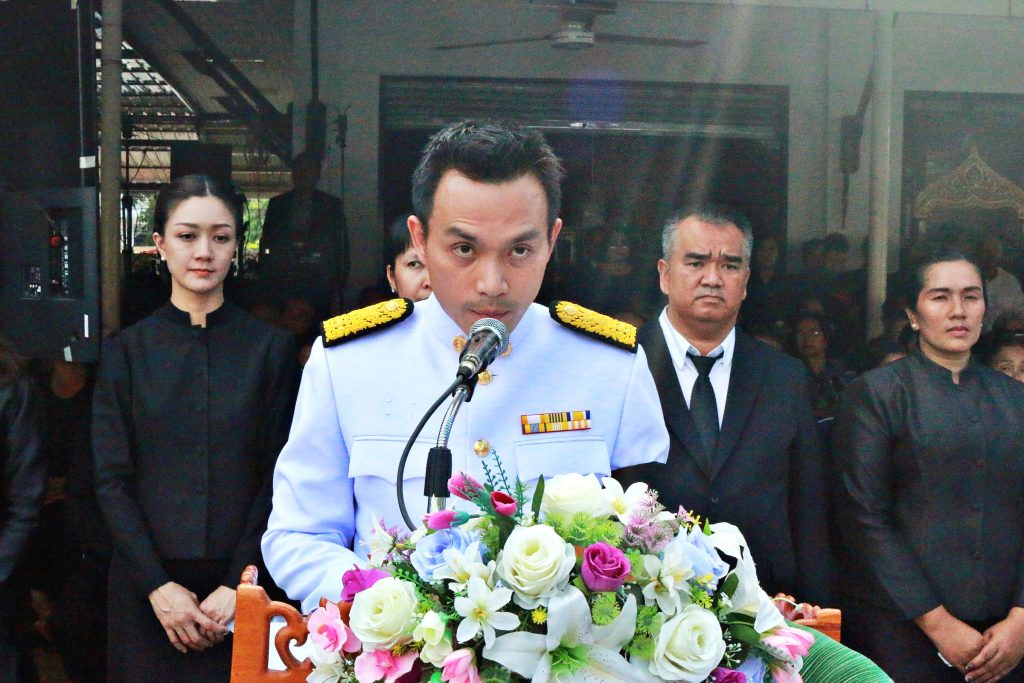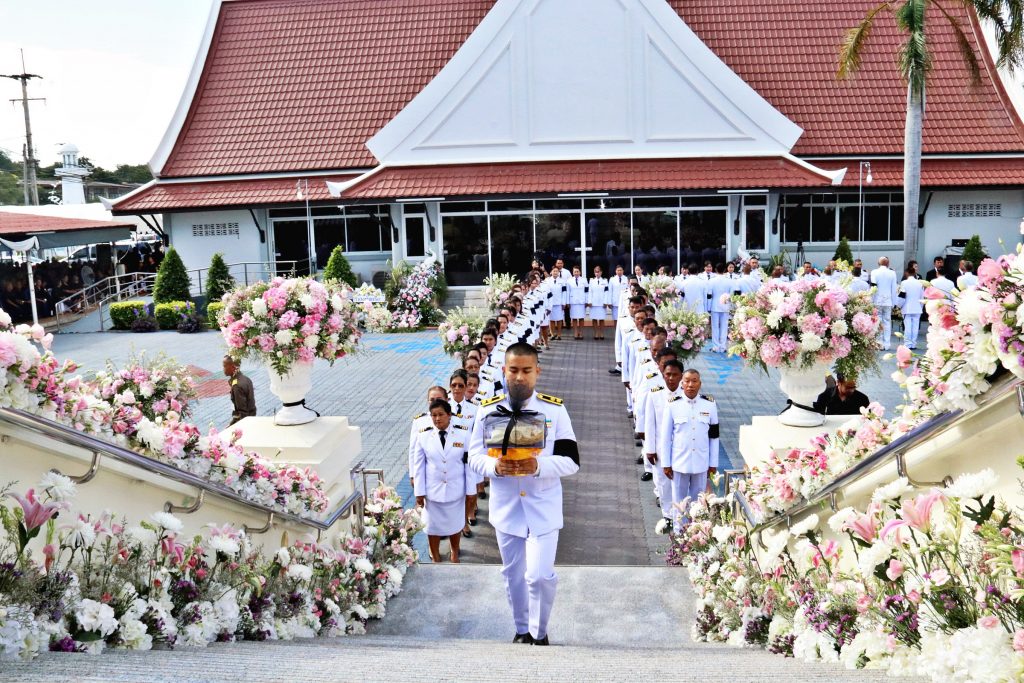 โดยมี ท่านเจ้าคุณพระปัญญารัตนาภรณ์ รองเจ้าคณะจังหวัดชลบุรี เจ้าอาวาสวัดชัยมงคล พระอารามหลวง เป็นประธานฝ่ายสงฆ์ พร้อมพระเถรานุเถระในพื้นที่อำเภอสัตหีบ,พลเรือโทบรรจบ โพธิ์แดง ผู้บัญชาการทัพเรือภาคที่ 1 ,พลเรือโท รณรงค์ สิทธินันท์ ผู้บัญชาการหน่วยบัญชาการนาวิกโยธิน,นายสนธยา คุณปลื้ม นายกเมืองพัทยา นายวิทยา คุณปลื้ม นายกองค์การบริหารส่วนจังหวัดชลบุรี นายอนุชา อินทศร นายอำเภอสัตหีบ ตลอดจนข้าราชการทหารตำรวจ องค์กรปกครองส่วนท้องถิ่น กำนันผู้ใหญ่บ้านอำเภอสัตหีบ นักธุรกิจ ญาติพี่น้องประชาชนชาวอำเภอสัตหีบและใกล้เคียง และแขกผู้มีเกียรติจำนวนมากร่วมงานพิธีพระราชทานเพลิงศพ กว่า 1,000 คน อย่างพร้อมเพรียง