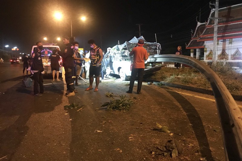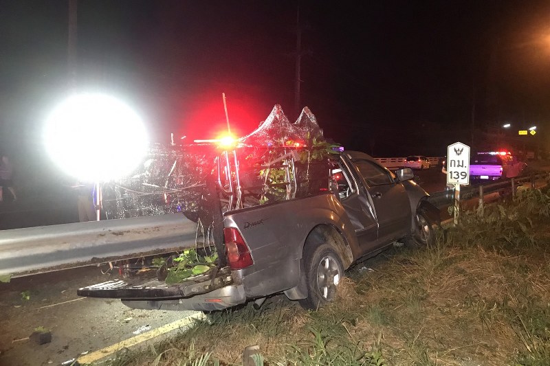 นครนายก – รถกระบะบรรทุกพันธุ์ไม้ เสียหลักชนเหล็กกั้นทางโค้งเสียบตัวรถทะลุโดนคนขับดับสยองคารถ