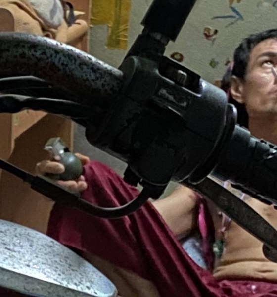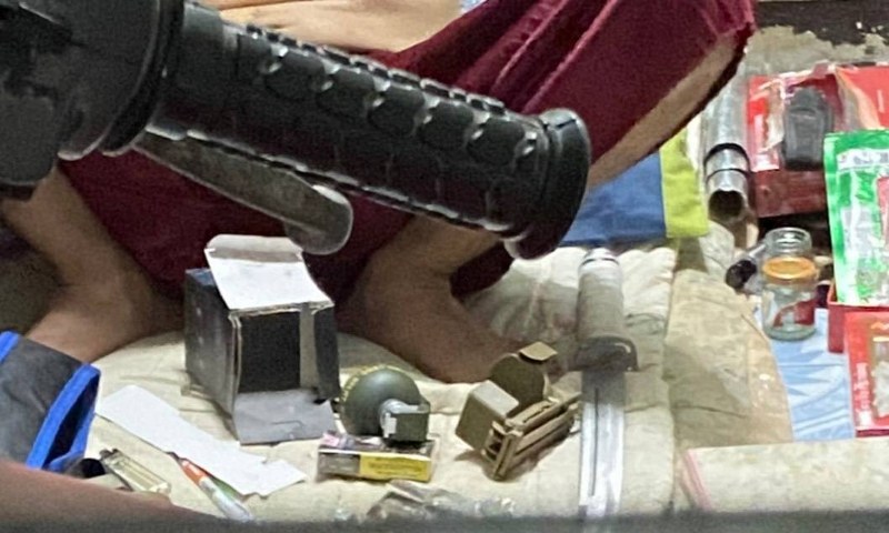 ซึ่งจากการตรวจสอบของเจ้าหน้าที่ตำรวจชุดชำนาญการเกี่ยวกับวัตถุระเบิด พบว่ามีระเบิดชนิด เอ็ม 67 จำนวน 2 ลูก อาวุธปืนลูกโม่ไม่ทราบขนาด 1 กระบอก และมีดยาวกว่า 50 เซ็น จำนวน 2 เล่มวางใกล้ตัว และกำลูกระเบิดในมือขวา 1 ลูก เจ้าหน้าที่ได้สอบถามแม่ และพี่สาวที่ยังอยู่อาการตื่นตระหนก ทราบว่าไม่เคยเห็นอาวุธดังกล่าวมาก่อน ก่อนแจ้งความมันอาละวาดหนัก โดยเอาอาวุธนาๆชนิดที่เห็นออกมาข่มขู่ จนต้องหนีกระเจิง โทรแจ้งความโดยทิ้งสามีที่ป่วยติดเตียง พ่อไอ้คลั่งอยู่ในห้องคนเดียวภายในบ้าน