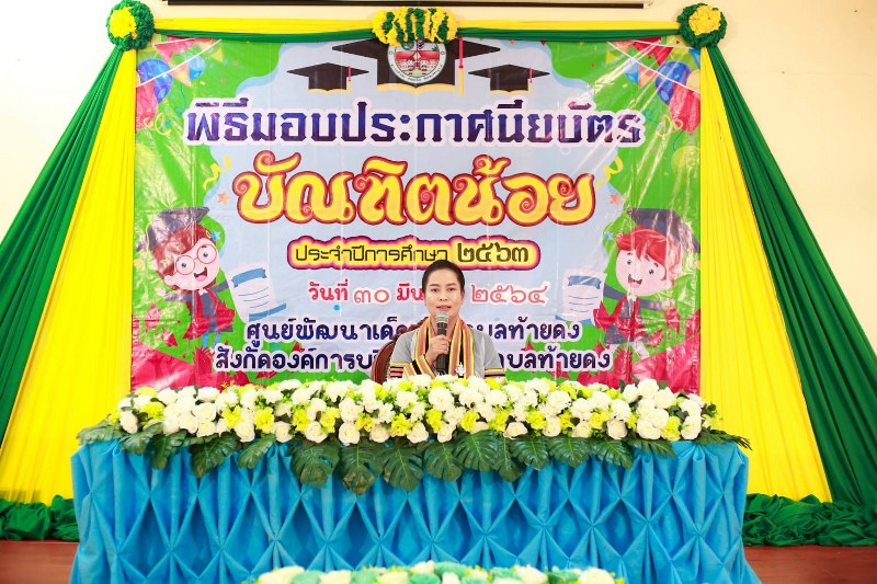 หลังจากนั้นนางสาวฉัตรนภา เมืองแป้น นายกองค์การบริหารส่วนตำบลท้ายดงได้กล่าวให้โอวาทกับบัณทิตน้อยว่า การจัดพิธีมอบประกาศนียบัตรแก่บัณฑิตน้อยในครั้งนี้ เพื่อให้เด็กเกิดความภาคภูมิใจที่จบการศึกษาระดับชั้นปฐมวัย สร้างขวัญกำลังใจให้กับเด็กเกิดความมุ่งมั่นที่จะศึกษาในระดับชั้นที่สูงขึ้นต่อไป องค์การบริหารส่วนตำบลท้ายดง พร้อมส่งเสริมสนับสนุนด้านการศึกษาและพัฒนาศักยภาพของเด็กปฐมวัย ส่งเสริมกระบวนการเรียนรู้ที่สนองต่อธรรมชาติ และพัฒนาการของเด็กแต่ละคนตามศักยภาพ ภายใต้สภาพแวดล้อมที่ปลอดภัย เอื้ออำนวยต่อการพัฒนา เป็นการสร้างเสริมคุณภาพชีวิตให้เด็กพัฒนาไปสู่ความสมบูรณ์ เกิดคุณค่าต่อตนเองและสังคมต่อไป