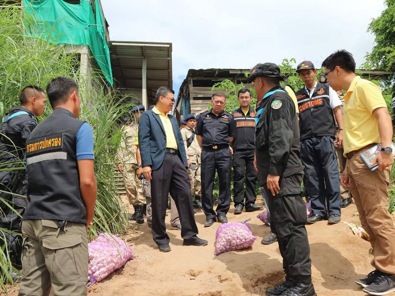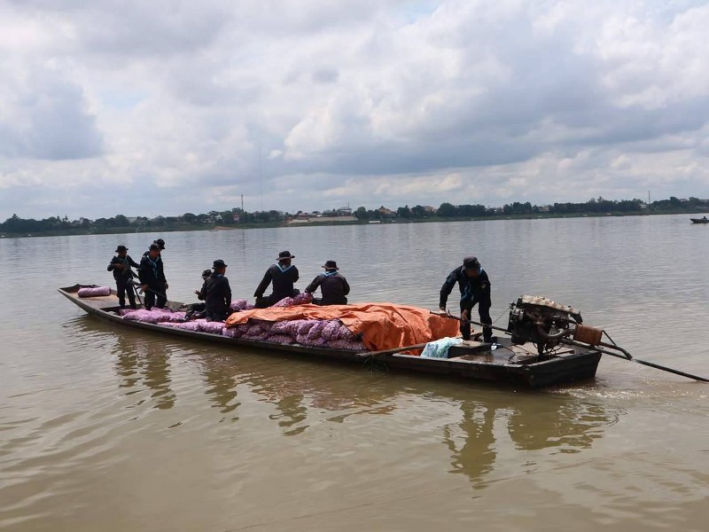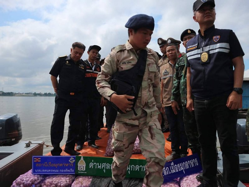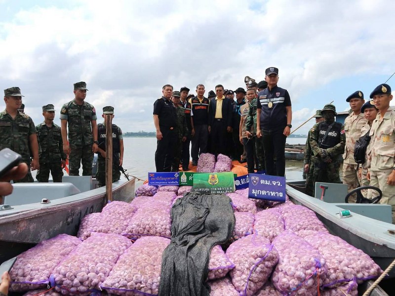 ตรวจสอบบริเวณโดยรอบพบกระสอบบรรจุกระเทียมแห้งทิ้งอยู่บริเวณทางขึ้นและริมตลิ่ง จำนวน 12 กระสอบ และในเรือบรรทุกอีกจำนวนมาก ตรวจนับรวมกันแล้วได้จำนวน 350 กระสอบ กระสอบละ 20 กิโลกรัม รวมน้ำหนัก 7,000 กิโลกรัม และไม่พบเครื่องหมาย หรือยี่ห้อของการนำเข้า จึงได้ตรวจยึดของกลางทั้งหมดนำส่งด่านศุลกากรมุกดาหาร ดำเนินการตามกฎหมาย
