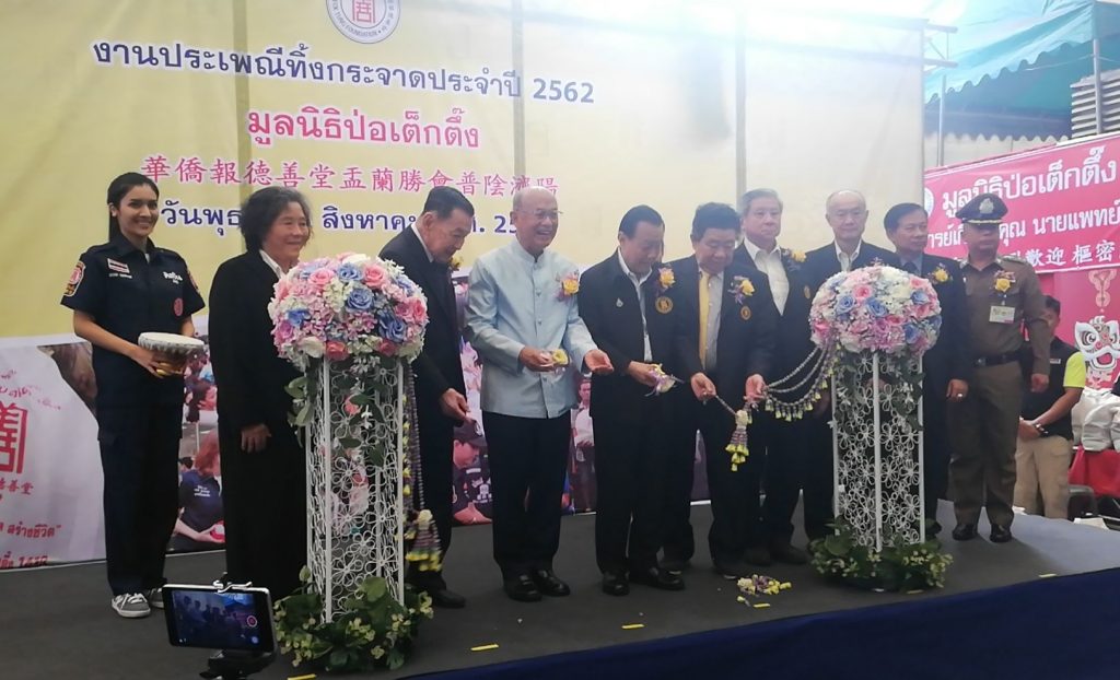 โดยเมื่อวันที่ 4 และ 11 สิงหาคม 2562 ที่ผ่านมา มูลนิธิฯ ได้ทำพิธีแจกจ่ายเครื่องอุปโภคบริโภค ณ สุสานมูลนิธิป่อเต็กตึ๊ง อำเภอบ้านแพ้ว จังหวัดสมุทรสาคร และ คลินิกการประกอบโรคศิลปะสาขาการแพทย์แผนจีนหัวเฉียว หรือ คลินิกการแพทย์แผนจีนหัวเฉียว สาขาโคราช ทั้งนี้ มูลนิธิฯ ได้พัฒนาการแจกจ่ายสิ่งของเครื่องใช้ ให้เข้ากับการใช้งานในแต่ละยุคแต่ละสมัย เพื่อให้เกิดประโยชน์สูงสุดแก่ผู้รับ โดยเฉพาะอย่างยิ่งวัสดุในการบรรจุสิ่งของที่มูลนิธิฯ ได้ปรับเปลี่ยนให้เป็นถุงผ้า เพื่อลดการใช้พลาสติก อันก่อให้เกิดภาวะโลกร้อน อีกทั้งให้ผู้รับได้นำไปใช้ประโยชน์ในระยะยาวต่อไป รวมมูลค่าการจัดงานประเพณีทิ้งกระจาด ประจำปี 2562 เป็นจำนวนเงินทั้งสิ้น 13,950,000 บาท (สิบสามล้านเก้าแสนห้าหมื่นบาทถ้วน)