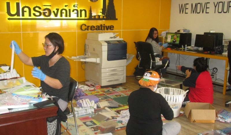 สำหรับหน่วยงานหรือร้านค้า ที่ประสงค์จะให้เราผลิตหน้ากากใสให้ ทางร้านจะผลิตให้ฟรี แต่ขอให้ซื้อวัสดุอุปกรณ์ อาทิ ฟองน้ำชิ้นละ 5 บาท ยางยืดกว้าง 1 นิ้ว ม้วนละ 150-180 บาท หน้าปกใสห่อสมุดตามร้านเครื่องเขียนแพ็กละ 130 บาท กาว 2 หน้ายี่ห้อ 3 M มาให้ เราก็จะผลิตไปเรื่อยไม่มีวันหยุด ตั้งเป้าผลิตได้วันละ 1,500 ชิ้น ส่วนร้านค้าหรือห้างร้านและหน่วยงาน เรายังพิมพ์สติ๊กเกอร์ติดให้ในราคาแผ่นละ 3 บาทฟรีอีกด้วย เพื่อช่วยป้องกันโรคโควิด-19 ก่อนจะปิดรับงานที่ร้านนาน 15 วัน แต่เก็บตัวลูกน้องในร้านเพื่อผลิตหน้ากากใสทุกวัน