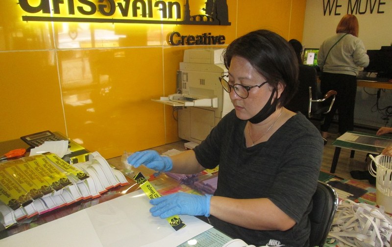 พบพนักงานของร้านร่วม 10 คน กำลังผลิตหน้ากากใสอย่างขะมักเขม้น มี น.ส.ลัดาวัลย์ คำสงค์ วัย 43 ปี เจ้าของร้าน กล่าวว่า ร้านแห่งนี้เปิดรับทำป้ายทุกชนิดมานาน 10 ปี มีลูกน้อง 18 คน ช่วงสถานการณ์เชื้อโคโรน่า โควิด -19 แพร่ระบาด ตนไปตระเวนไปหาซื้อหน้ากากอนามัยค่อนข้างหายากและมีราคาแพง บางแห่งตกชิ้นละ 10 บาท ลูกน้องต้องใช้สวมใส่ทำงานในห้องแอร์ทุกวัน บางครั้งก็อึดอัดคุยกับลุกค้าไม่สะดวก หลังดูทีวีรายงานวู้ดดี้พบการสาธิตผลิตทำหน้ากากใส จึงเกิดไอเดียผลิตทำให้ลูกน้องสวมใส่แทนหน้ากากอนามัยที่ขาดแคลนหนักมาได้ 3-4 วันแล้ว