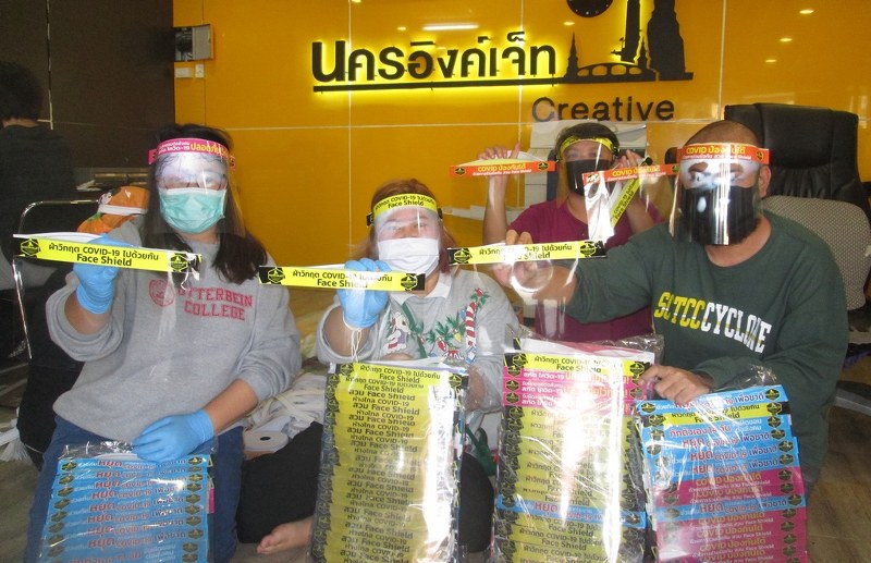 วันที่ 25 มี.ค. ผู้สื่อข่าวรับแจ้งว่า มีร้านทำป้ายสื่อโฆษณาชื่อร้านนครอิงค์เจ็ท ถนนเฟื่องนคร (ใกล้สถานี บขส.) อ.เมือง จ.นครพนม ผลิตหน้ากากใส คล้ายหน้ากากแพทย์ แทนหน้ากากอนามัย หรือ แมสก์ ที่หายาก แจกบุคลากรทางการแพทย์ โรงพยาบาลส่งเสริมสุขาภาพ (รพ.สต.) สำนักงานสาธารณสุข รพ.นครพนม และหน่วยงานอื่น 10,000 ชิ้นฟรี ก่อนเคลียร์งานของร้านเพื่อปิดร้านรับงาน 15 วัน